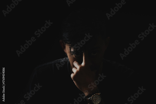 Sad Man in Dark Shadow with Hand on Face. Perfect for themes of depression, loneliness, or mental health awareness.