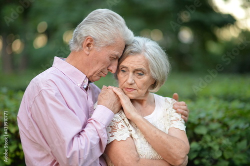 Sad thoughtful senior couple in park