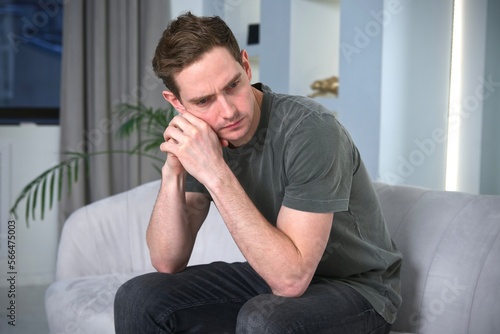Sad upset depressed unhealthy guy, young tired exhausted frustrated man is suffering at home, sitting on couch or sofa, having headache, migraine. Failure, despair, depression concept