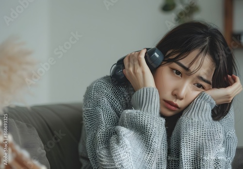 woman, sad, depressed, bad news, phone call, sofa, living room, modern, white, interior, asian, portrait, emotion, feeling, photo, photo, lifestyle, sitting, leaning, head, black, phone, receiving, bad, news, white background, shot, camera, lens