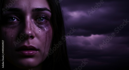 woman, sad, crying, tear, storm, cloud, dark, moody, emotion, pain, grieved, distress, heartache, lonely, depressed, vulnerable, melancholic, upset, grief, despair, brokenhearted, emotional, portrait, closeup, face, sorrowful, night, stormy, dramatic, beautiful, photo, image, feeling