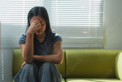 woman, sorrowful, depression, sofa, window, home, face, hand, cephalalgia, migraine, grief, bad, news, stress, anxiety, loneliness, mental, health, psychology, problem, suffering, despair, frustration, negative, emotion, burnout, fatigue, exhaustion, pain, grieved, worry, fear, alone, indoor, sitting, young, female, lifestyle, expression, portrait, unhappy, pensive, contemplative, worried, troubled, disease, emotional