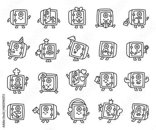 Safe cute kawaii character set featuring adorable cartoon vaults with expressive faces, fun props, and charming emotions for your illustration and creative designs projects
