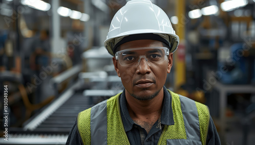 Safety helmet factory worker wearing protective glasses and reflective vest, focused expression