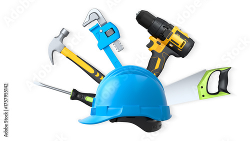 tool, construction, helmet, safety, drill, wrench, hammer, equipment, repair, hardware, maintenance, power, pipe, clipping, path, industrial, work, labor, protection, gear, engineering, manual, electric, hand, mechanic, building, site, job, hard-wearing, strong, men at work, fix, install, contractor, carpenter's shop, bricolage, machinery, professional, service, utility, occupation, plastic, steel, secure, isolated, white, background
