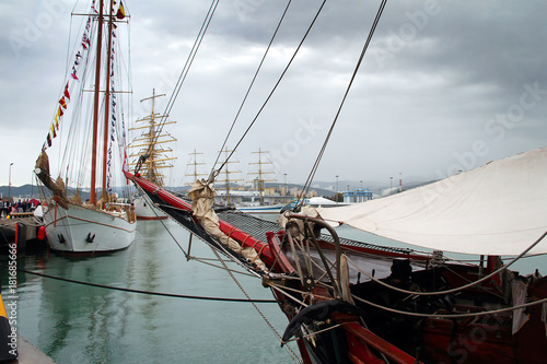 ship, sailing, tall, sail, sailboat, boat, water, port, blue, travel, vessel, cruise, mast, sea, sky, transportation, harbor, vintage, ocean, historic, nautical, voyage, barque, marin, regatta, white, old, flag, retro, tour tourism, europa, russia