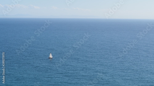 Sailboat sailing alone and in the distance in the middle of the sea on a sunny day