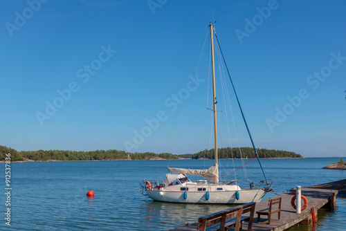 Sailboat tied to a mooring buoy at the harbor of the island in Finland, Baltic sea, Yacht in Shore marina in Baltic Sea, a safe anchorage for yachts and sail boats.