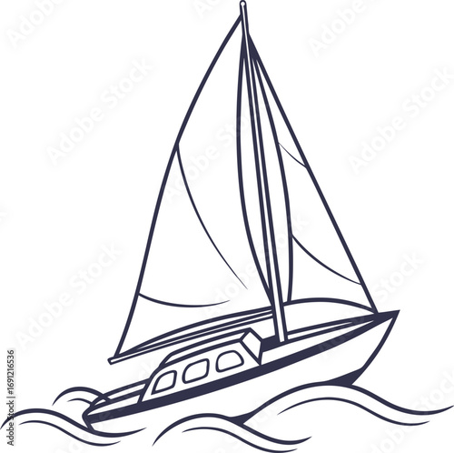 sailboat, sailing, boat, water, ocean, sea, nautical, marin, travel, vacation, leisure, recreation, sport, adventure, journey, voyage, transport, transportation, vessel, ship, yacht, dinghy, skiff, mast, sail, rigging, hull, deck, wave, ripple, movement, wind, breeze, freedom, escape, summer, sunny, day, illustration, drawing, vignetting, outline, simple, minimalist, graphic, design, icon, yachting, vector