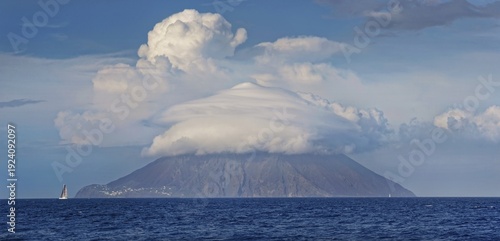 Sailing ship in front of Stromboli volcano and island with bizarre cloudscape, Stromboli, Calabria, Italy