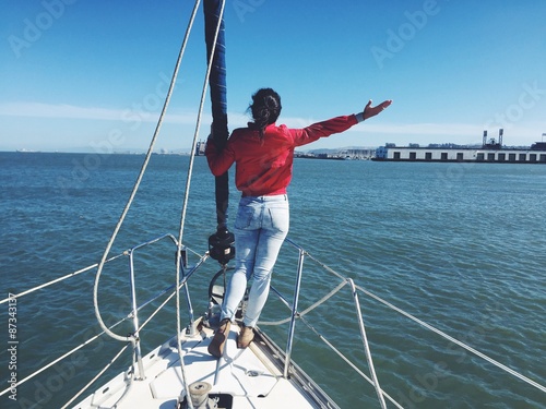 sailing, female model, bay area, sailboat, red, freedom, happiness
