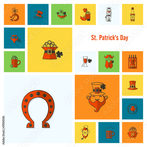 vector, st, patrick, day, leprechaun, clover, shamrock, hipster, gnome, beard, goggles, hat, shoe, nubes, gold, coin, beer, colourful, bright, collection, set, vibrant, colours, froth, alcohol, mug, pot, horseshoe, flag, moustache, calendar, holiday, icon, irish, ireland, celebration, illustration, symbol, design, march, spring, happy, signs, flat, element, decoration, traditional