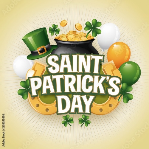 day, gold, pot, coin, hat, leprechaun, horseshoe, shamrock, balloon, green, white, orange, irish, celebration, holiday, festive, background, yellow, radiating, line, clover, spring, ireland, march, tradition, lucky, fortune, stylised, font, cheerful, composition, design, illustration, nobody, indoor