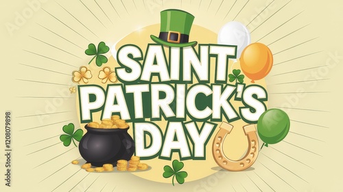 day, gold, pot, coin, hat, leprechaun, horseshoe, shamrock, balloon, green, white, orange, irish, celebration, holiday, festive, background, yellow, radiating, line, clover, spring, ireland, march, tradition, lucky, fortune, stylised, font, cheerful, composition, design, illustration, nobody, indoor