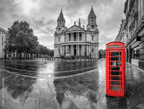 Saint Paul's cathedral and red telephone box on rainy day in London. England