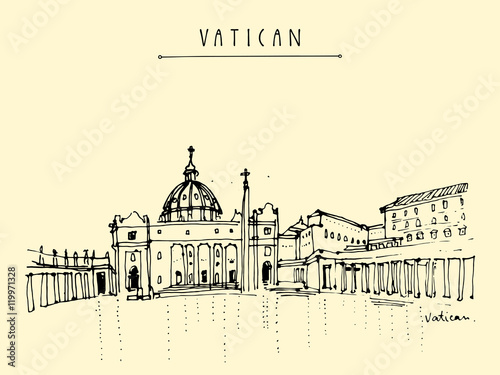 Saint Peter cathedral and Apostolic Palace in Vatican city, Europe. Hand drawing. Travel sketch. Vintage touristic postcard, poster, calendar or book illustration