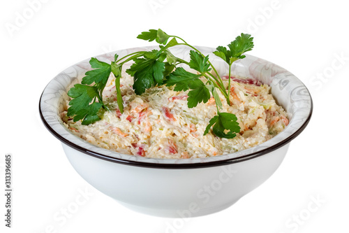 salad of rice, vegetables with mayonnaise in a bowl on a white background