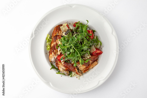 Salad of smoked eel, unagi sauce and greens with vegetables. Banquet festive dishes. Gourmet restaurant menu. White background.