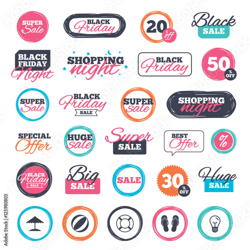 Sale shopping stickers and banners. Beach holidays icons. Ball, umbrella and flip-flops sandals signs. Lifebuoy symbol. Website badges. Black friday. Vector
