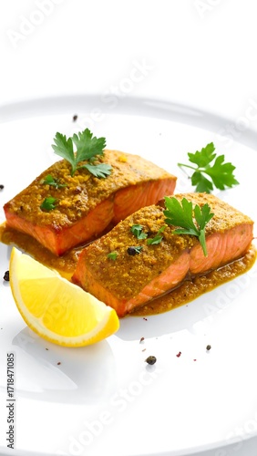salmon, cooked, plate, lemon, sauce, parsley, spicey, healthy, food, dish, eatery, cookery, crockery, orange, gold, yellow, garnish, closeup, appetising, flavorful, ocean, protein, dinner, alimentary, prepared, favor, served