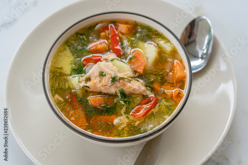 Salmon soup with potatoes, carrots, dill, pepper in bowl, close up