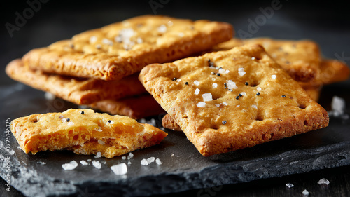 Salted crackers with seeds on dark slate surface.