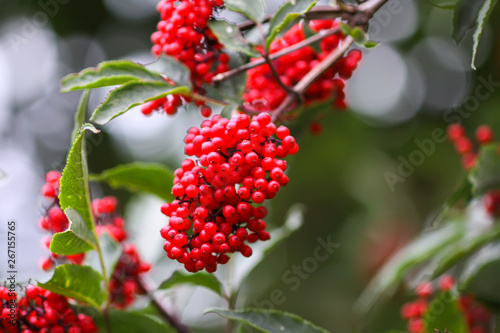 Sambucus racemosa, common red elderberry, red-berried elder berries on the branch in the garden.