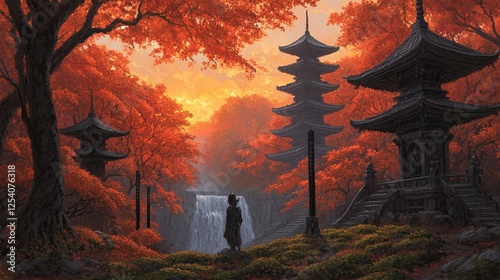 illustration, painting, art, warrior, samurai, sword, fighter, weapon, imagination, artwork, blade, bushido, red, autumn, waterfall, scenery, forest, shrine, sakura, rock, tree, nature, concept, red leaf, breathtaking, landscape