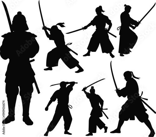 Samurai warrior silhouettes with katana swords in dynamic fighting poses isolated on white background, traditional Japanese warrior combat illustration set