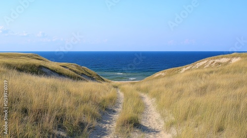 Sand dunes meeting the deep blue ocean, forming a unique contrast between land and sea.