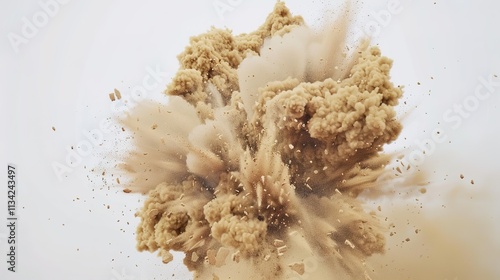 Sand flying, explosion on white background, creating a dynamic and intense scene. The swirling sand and the powerful burst of the explosion make for a visually striking and chaotic moment.