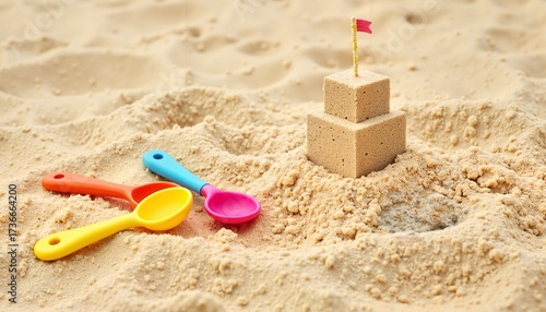 beach, sun, summer, sand, toy, colourful, flag, bucket, shovel, childhood, play, enjoyment, fun, vacation, coast, yellow, pink, blue, red, building, warm, sunny, day, leisure, adventure, excited, nature, relaxation, family, activity, children