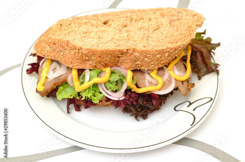 bread, closeup, delicious, food, fresh, green, ham, leaf, lettuce, lunch, meal, meat, natural, pepper, plate, red, sandwich, slice, tasty, vegetable, wheat, whole grain