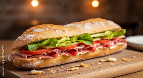 sandwich, ham, cheese, lettuce, tomatoes, baguette, crust, bread, meat, deli, lunch, ring, greener, slice, stack, fresh, visible, food, meal, platter, wooden, board, crisp, deliciously, texture, colours, layer, crusty, gold