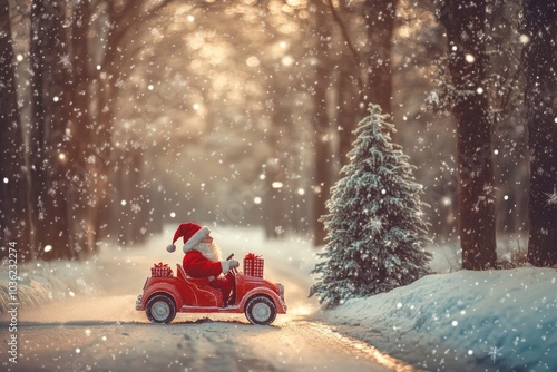 Santa Claus drives the red toy car and delivers presents and christmas tree snowy winter forest at christmas night background. Holidays card. Christmas or new year background. Holidays card, ai