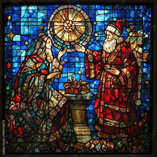 narrative, storytelling, handcraft, mary, virgin, gift, belief, mosaic, claus, giving, stained, ornate, spiritual, santa, faith, christianity, cathedral, artistic, hand-made, december, icon, craft, religious, church, vibrant, festive, window, religion, christmas, scene, glasses, history, detail, symbol, winter, celebration, culture, art, traditional, decoration, holiday, season, bright, light, colourful, design