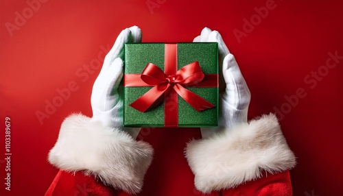 Santa Claus hands holding a green gift box with a red ribbon on a red background, Christmas celebration and gift giving concept