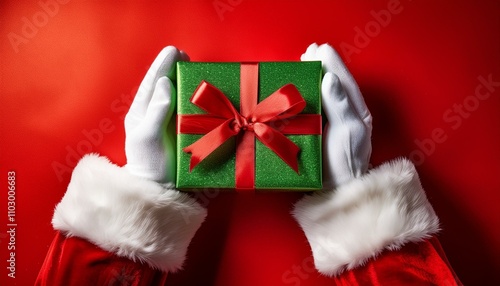 Santa Claus hands holding a green gift box with a red ribbon on a vibrant red background, representing Christmas celebration and gift giving