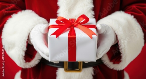 santa, claus, gift, present, ribbon, bow, white, red, hand, glove, christmas, holiday, festive, season, giving, celebration, winter, december, joy, happy, classic, traditional, merry christmas, gift box, red ribbon, christmas gift, holiday season, red background, new year, closeup, festivity, merry, bright, box, event, santa