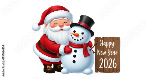 Santa claus hugging a snowman next to a happy new year 2026 wooden sign on transparent background
