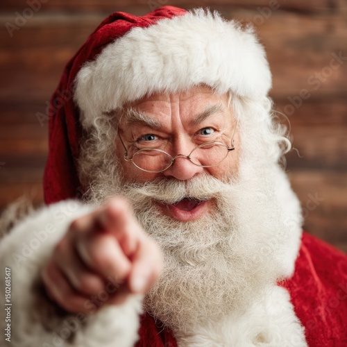 Santa Claus smiling and pointing directly at the camera on a white background, festive holiday portrait.