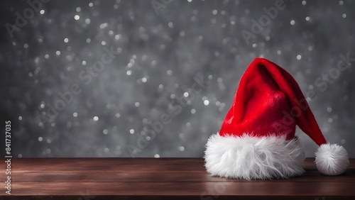 Santa Hat Standing On A Wooden Table Vibrant Red White Pom Pom. Generative AI