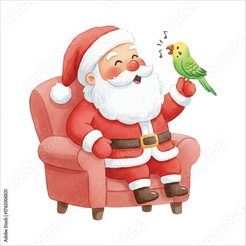 Santa with Parakeet Singing Watercolor Vector Illustration on White Background