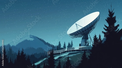 satellite dish, observing, night sky, star, mountain, landscape, antennae, communication, technology, science, astronomy, outer space, exploration, research, scientific, discovery, telescope, dish antenna, hill, tree, forest, pine, evergreen, environment, scene, night time, dark, observation, detection, remote, hillside, rural, remote sensing, telecom, starry, night, space exploration