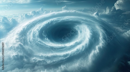 Satellite view of a huge spiral hurricane. Powerful forces of nature. The storm vortex is very large and has a hole in the center. Predicting and studying weather events. Illustration for design.