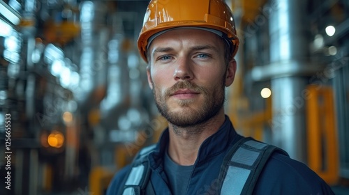 construction, men at work, helmet, safety, industrial, factory, machinery, equipment, smile, professional, vibrant, lighting, man, engineer, confidence, portrait, background, indoor, labor, blue, orange, safety-gear, tool, male, skilled