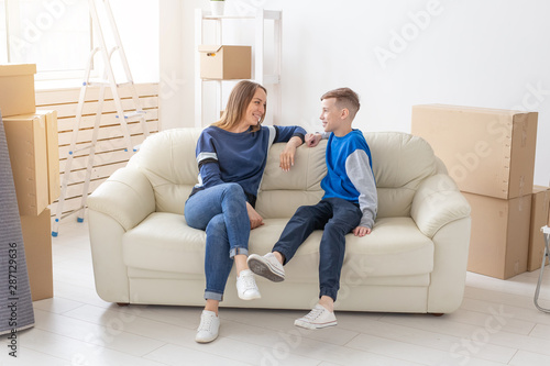 Satisfied happy caucasian single mother and son happily communicate discussing the design of the new apartment during the housewarming party.
