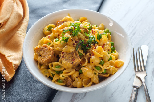 sausage, macaroni, cheese, shell, pasta, noodle, seashell, dish, bowl, italian, creamy, cheddar, yellow, meal, delicious, epicure, receipe, and, dinner, casserole, dinner, lunch, cookery, fork, food, sauce, noodle, british, green, pea, english, meat