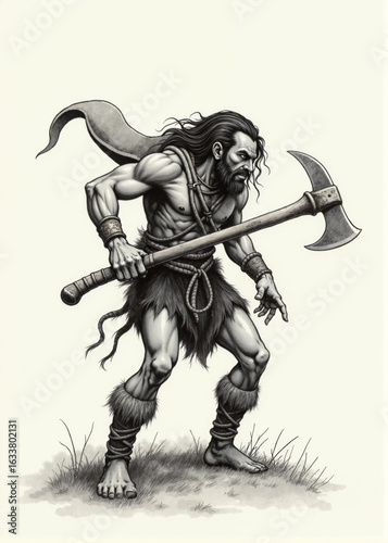 hunter, savage, rpg, fantasy, old school, tribal, primitive, axe, stone, wild, muscular, brow, brute, barbarian, warrior, cave, character, tabletop, primal, forest, rugged, survivor, ancient, strength, combat, prehistoric, feral, untamed, tough, earthy, fight, tool, muscle, gritty, traditional, aggressive, strong