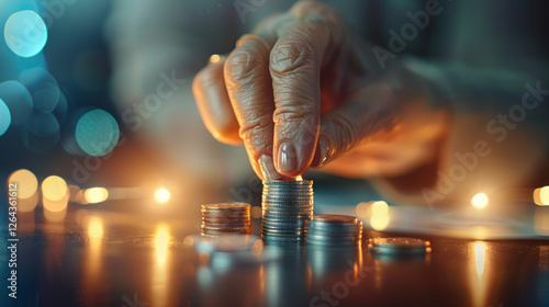 Saving for the Future: A close-up view of a weathered hand carefully placing coins on a stack, highlighting the importance of financial planning and saving for the future.